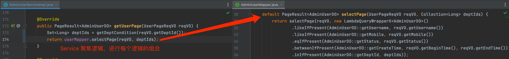 - 【出参】查询后,将 MyBatis Plus 的分页结果 IPage,转换成项目的分页结果 PageResult (opens new window)。代码如下图: