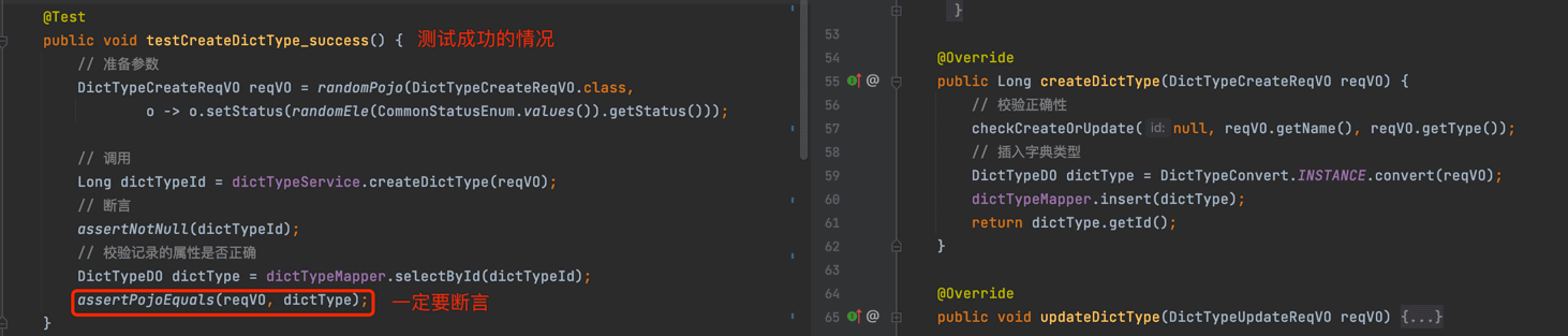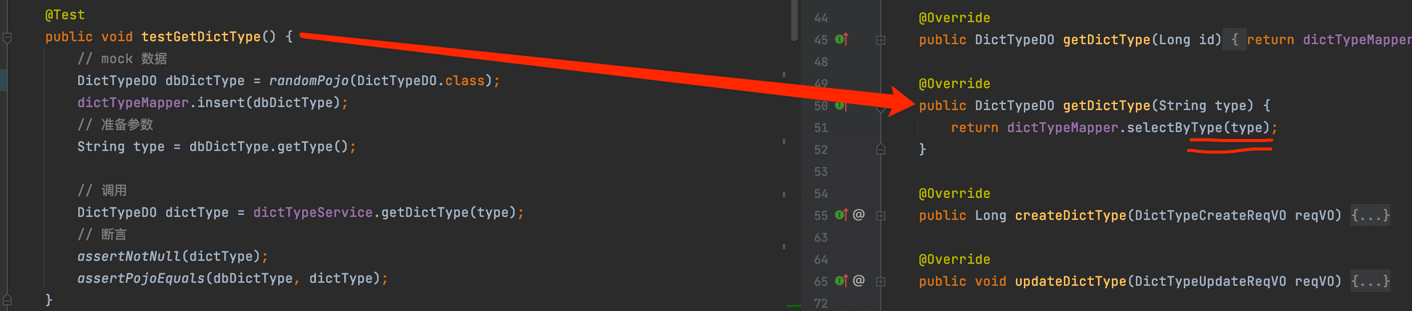 dictTypeMapper某种程度来说,也是一种外部依赖,但是通过内嵌的 H2 内存数据库,进行“真实”的数据库操作,反而单元测试的编写效率更高,效果更好,所以不需要 Mock 掉。
