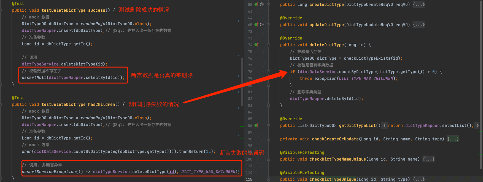 以字典类型模块的 DictTypeServiceImpl (opens new window) 为例子,讲解它的 DictTypeServiceTest (opens new window) 单元测试的编写实现。